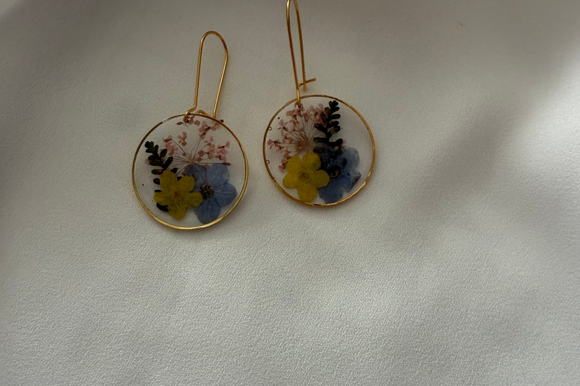 Resin Art Earrings Made With Real Yellow and Blue Forget me Nots. Gold Hooks